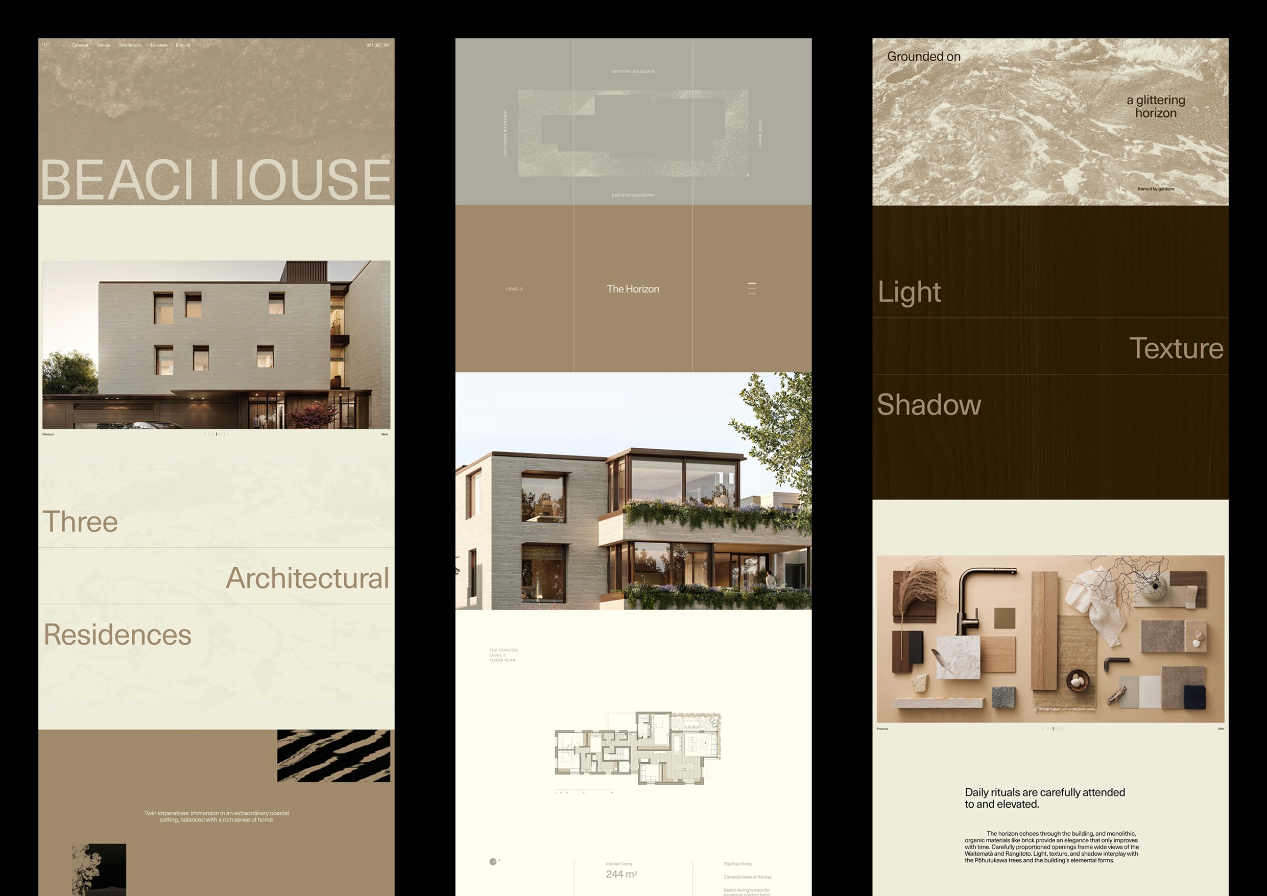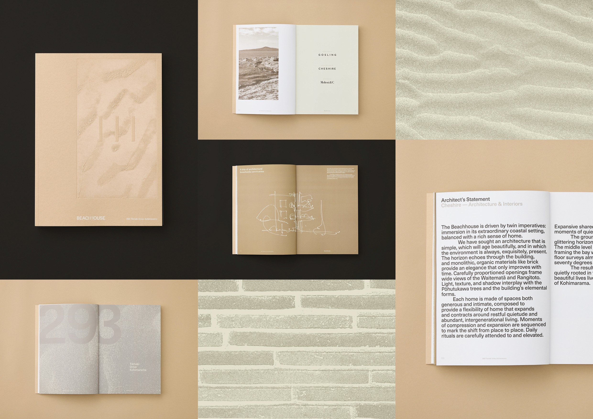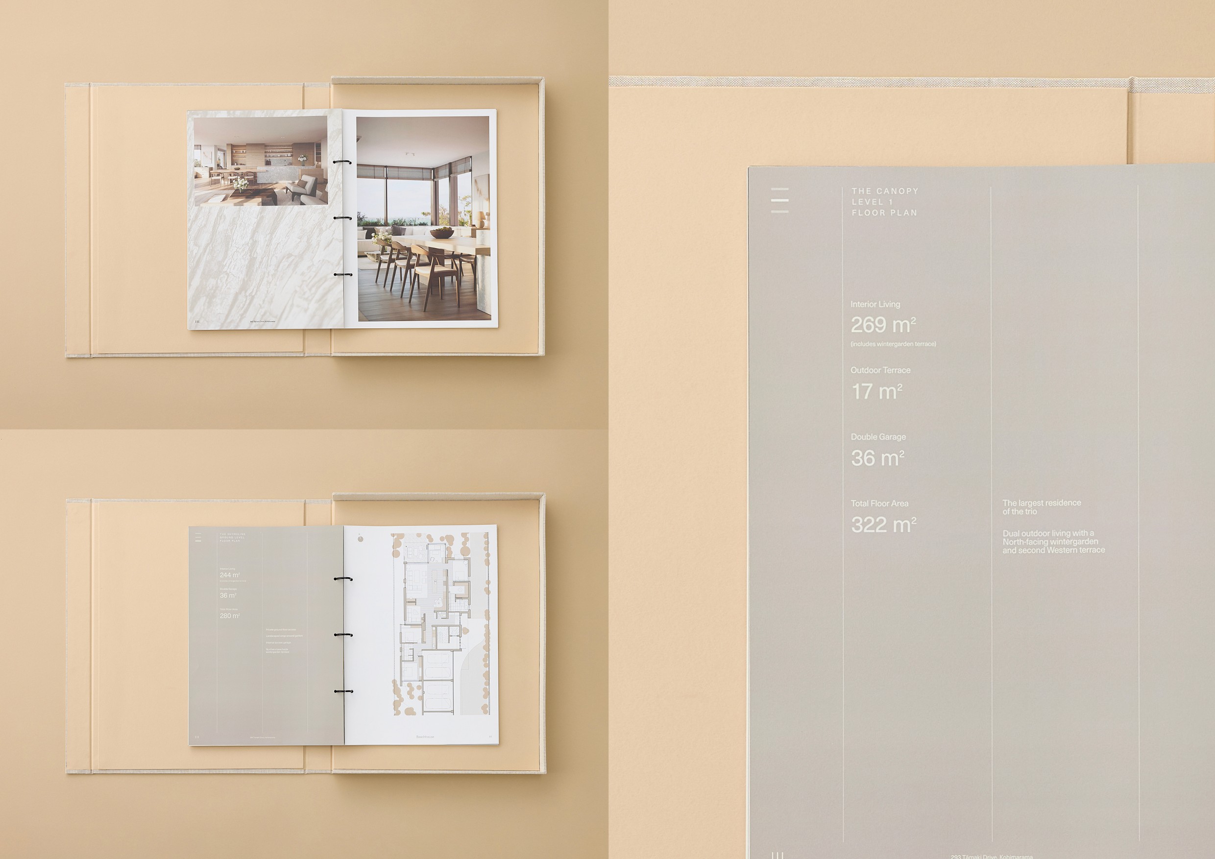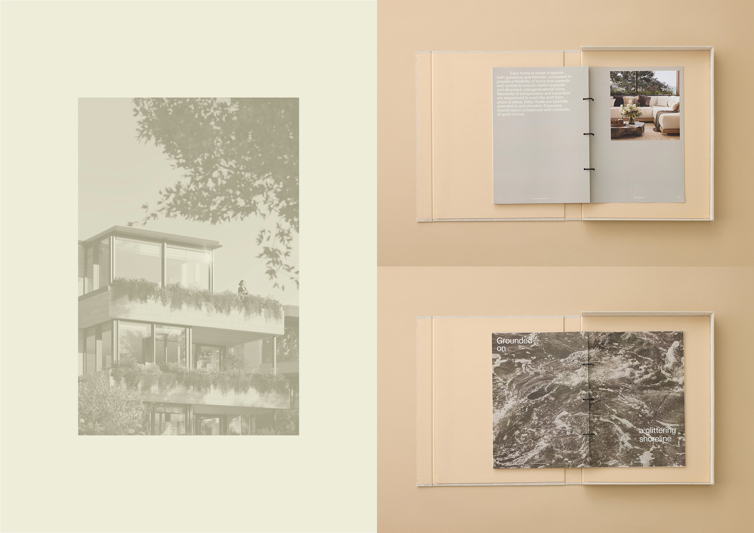 The identity centres on the concept of “three,” reflected through graphic elements, compositon and underlying grids. Typography is understated yet elegant, complemented by textures and materials inspired by the local environment—sand, sea, and Pōhutukawa trees. Each apartment is uniquely named to reflect its connection to the landscape: The Horizon, The Canopy, and The Shoreline.
