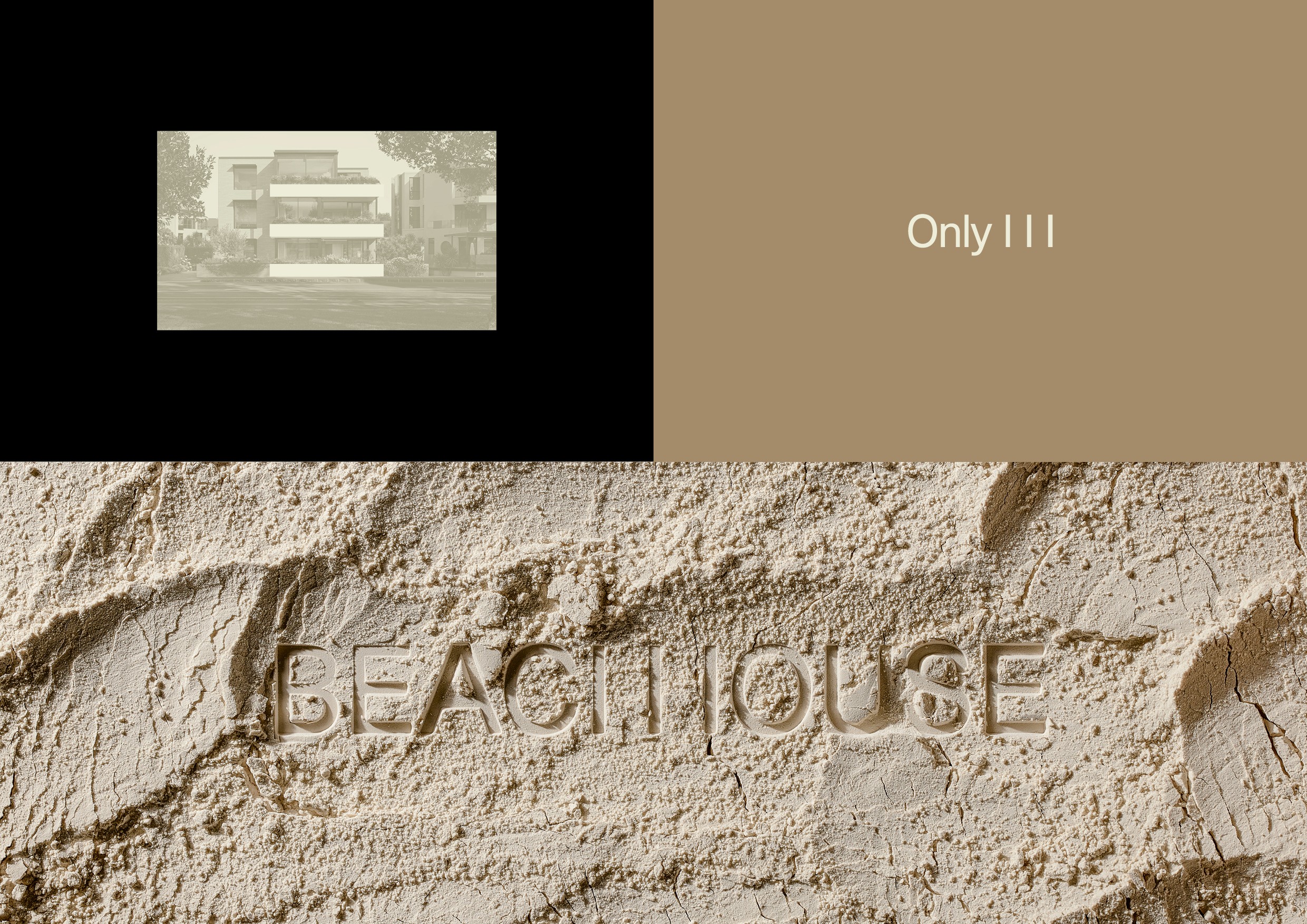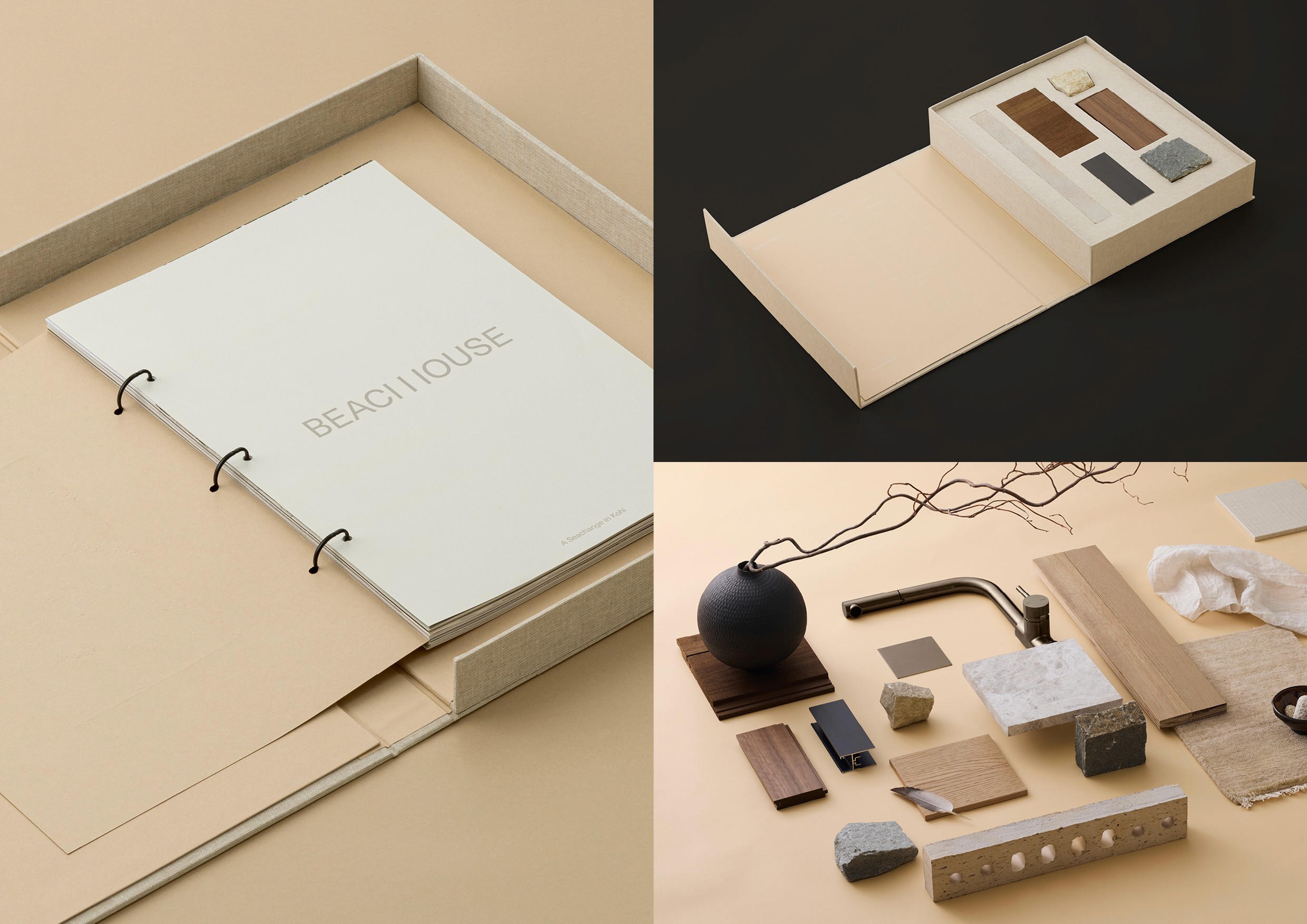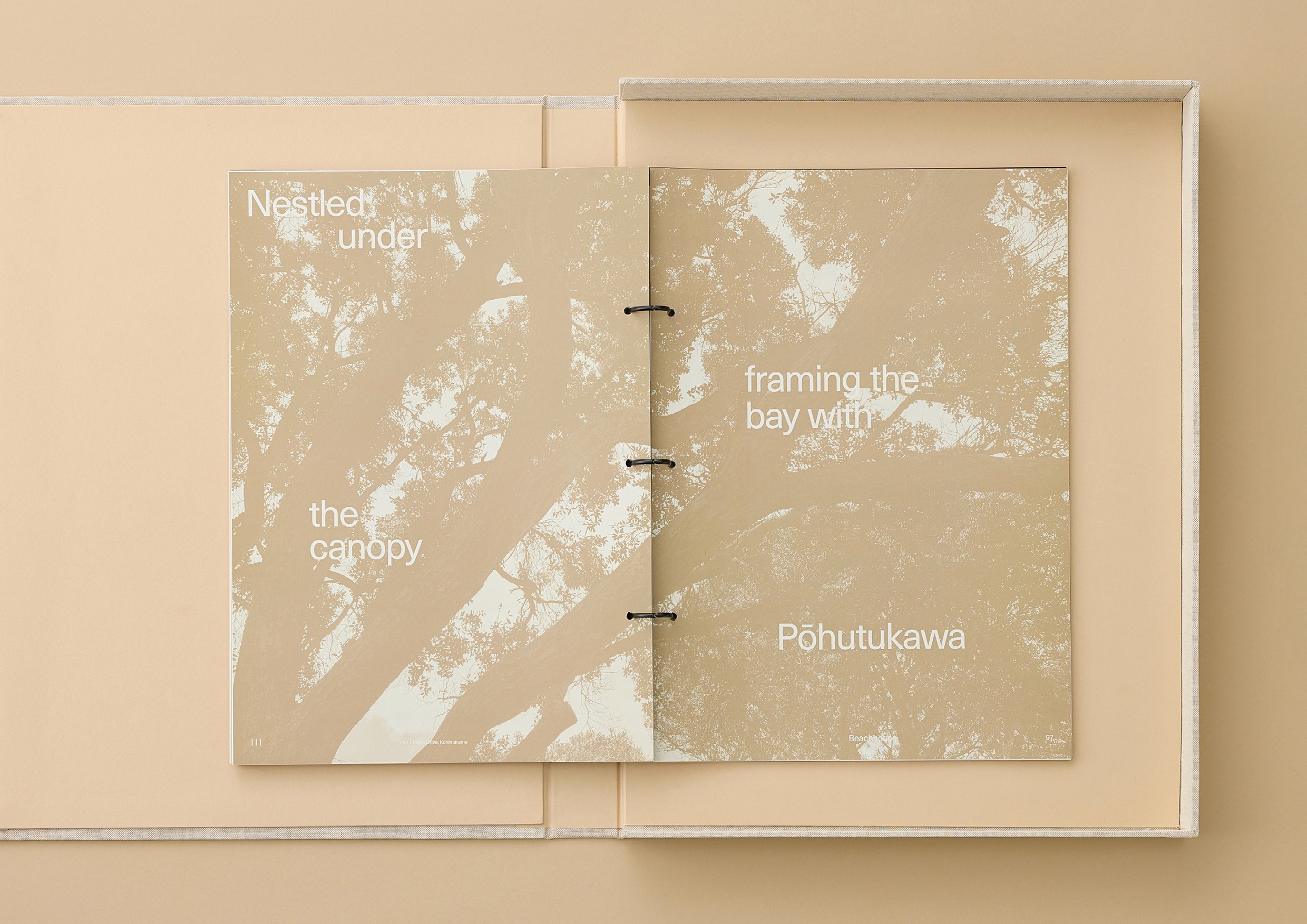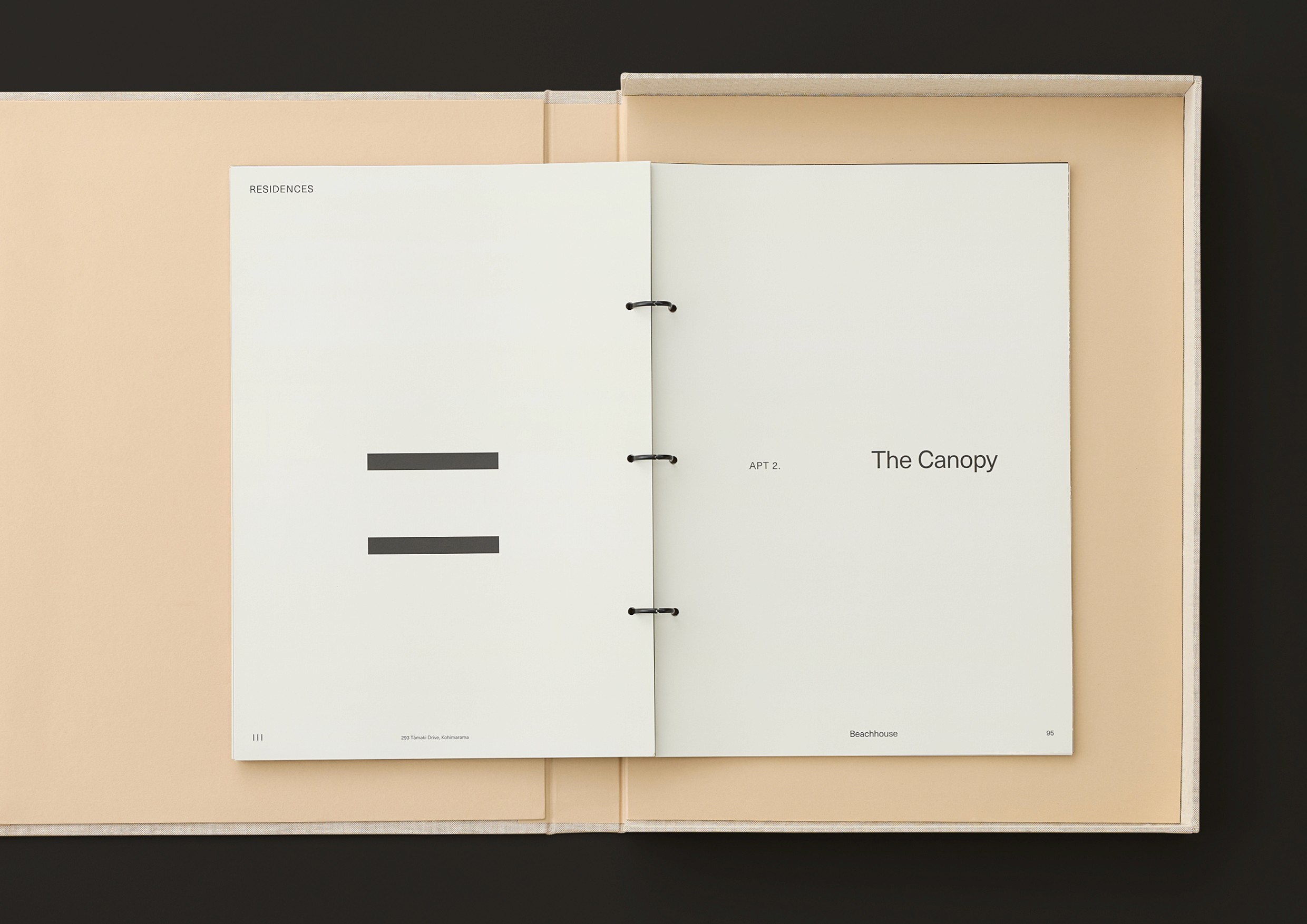 The identity centres on the concept of “three,” reflected through graphic elements, compositon and underlying grids. Typography is understated yet elegant, complemented by textures and materials inspired by the local environment—sand, sea, and Pōhutukawa trees. Each apartment is uniquely named to reflect its connection to the landscape: The Horizon, The Canopy, and The Shoreline.