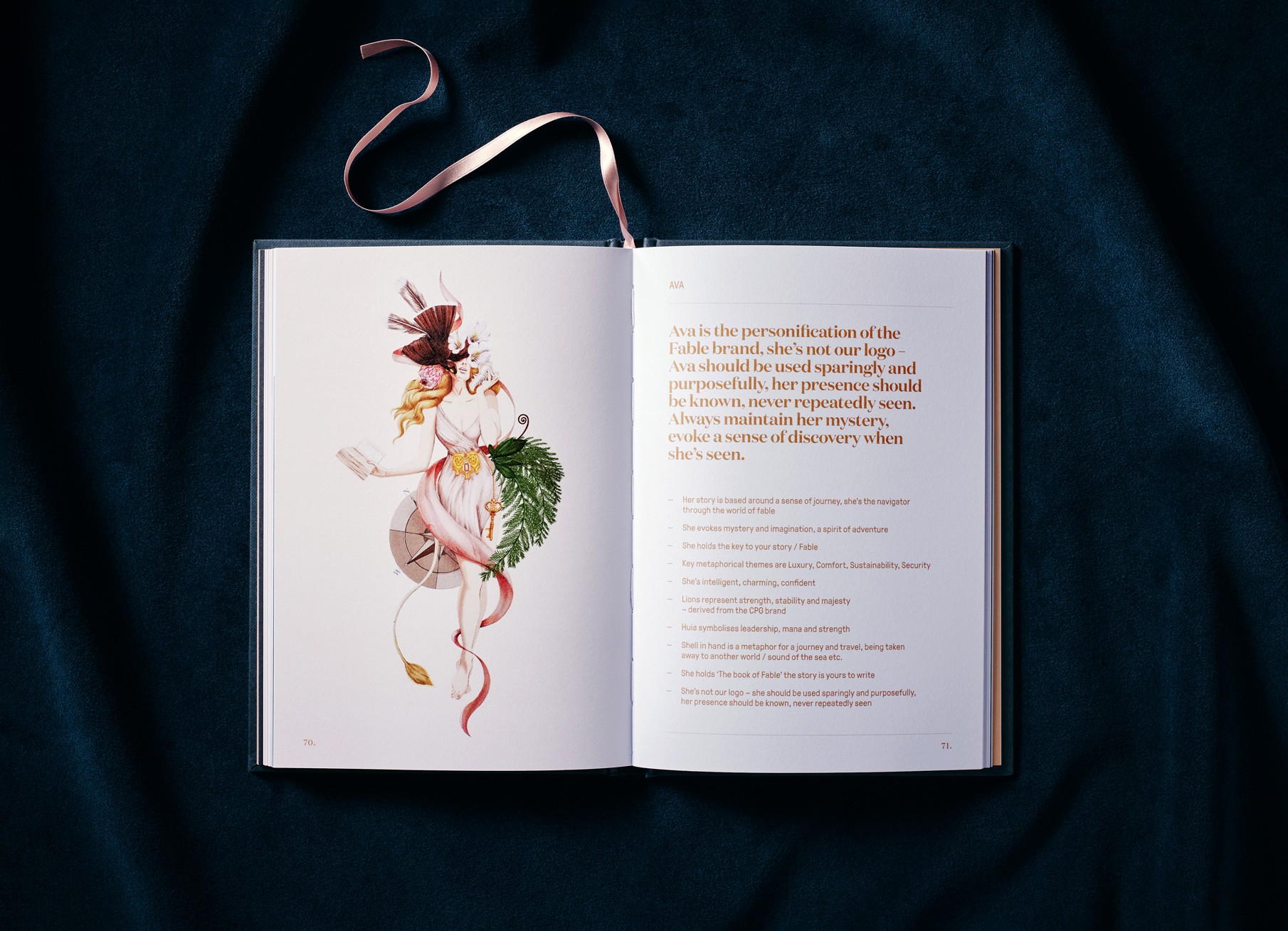 A crafted wordmark is paired with a mythical avatar, Ava, who embodies the spirit of the brand. Rich in symbolism, Ava references leadership, adventure, hospitality, and storytelling through elements such as the huia, seashell, compass, key, and book, alongside a nod to CPG Hotels’ twin lions. Used sparingly, Ava becomes a waypoint throughout the guest journey, with a simplified cameo extending her presence across brand touchpoints. A refined colour palette, premium materials, and considered typography balance lush detail with functional clarity. An elegant serif supports playful brand moments, offset by a refined sans serif for utility. Thoughtful collateral, including gold pens and bookmarks, reinforces storytelling and leaves guests with a tangible memory of their experience.