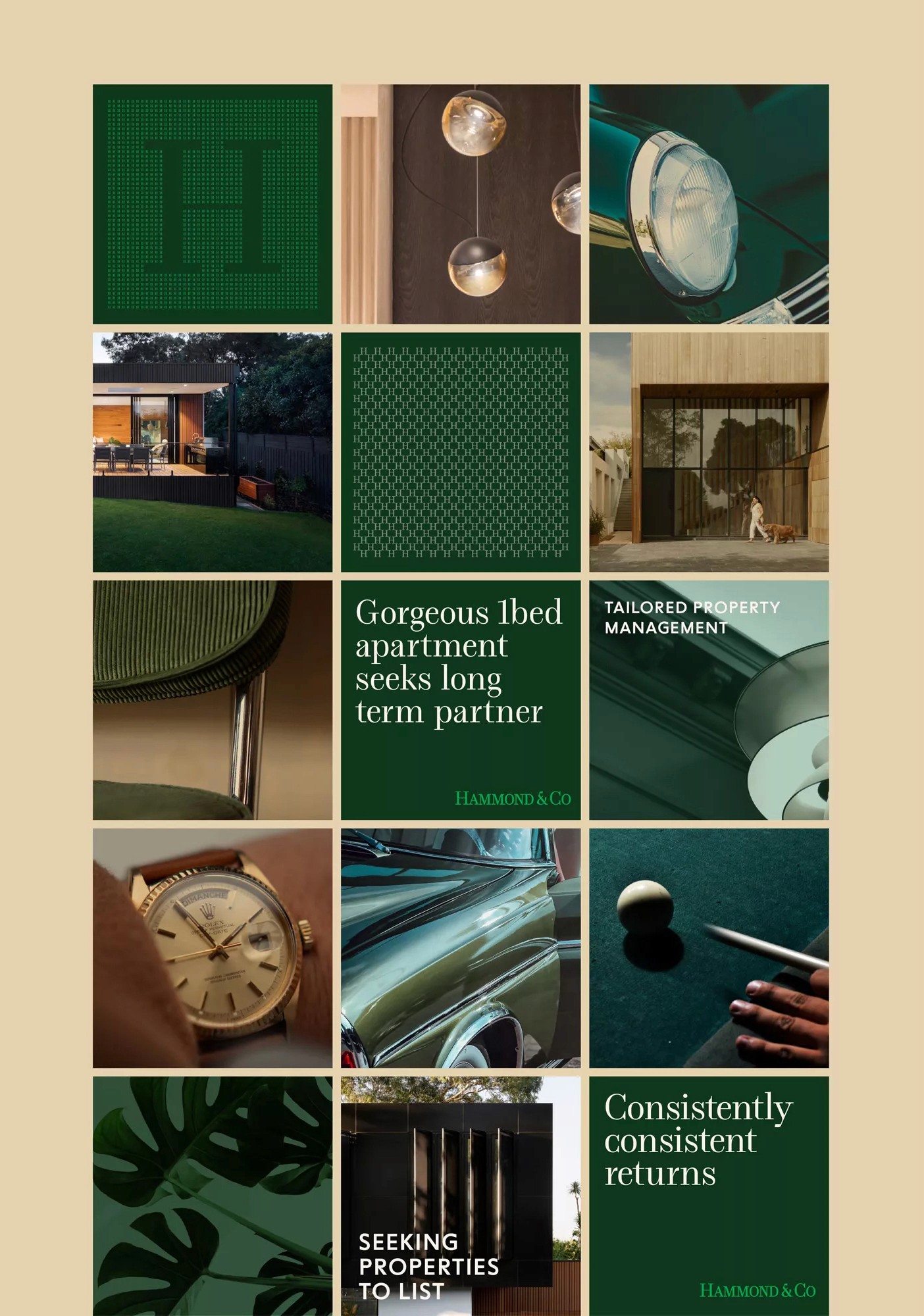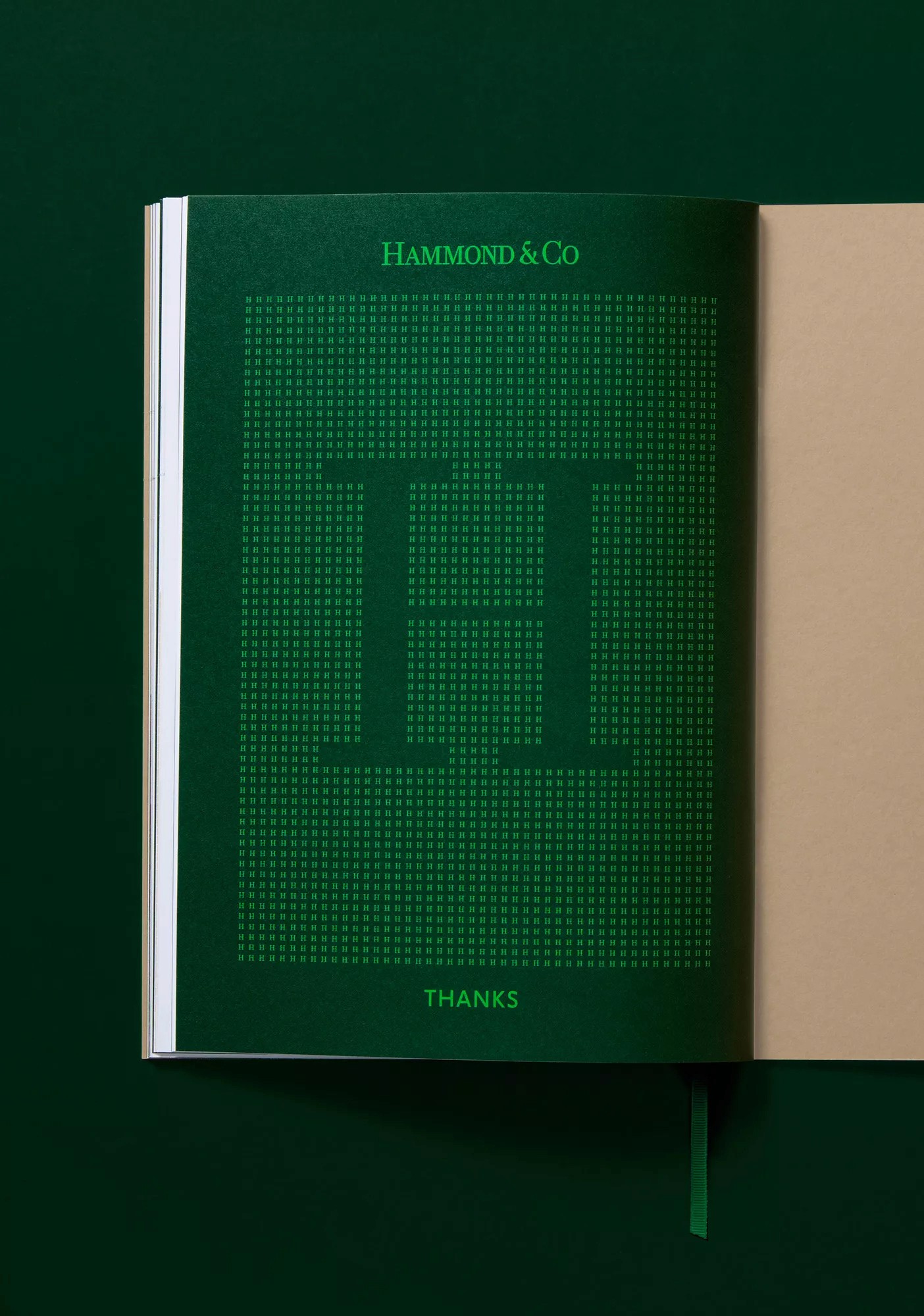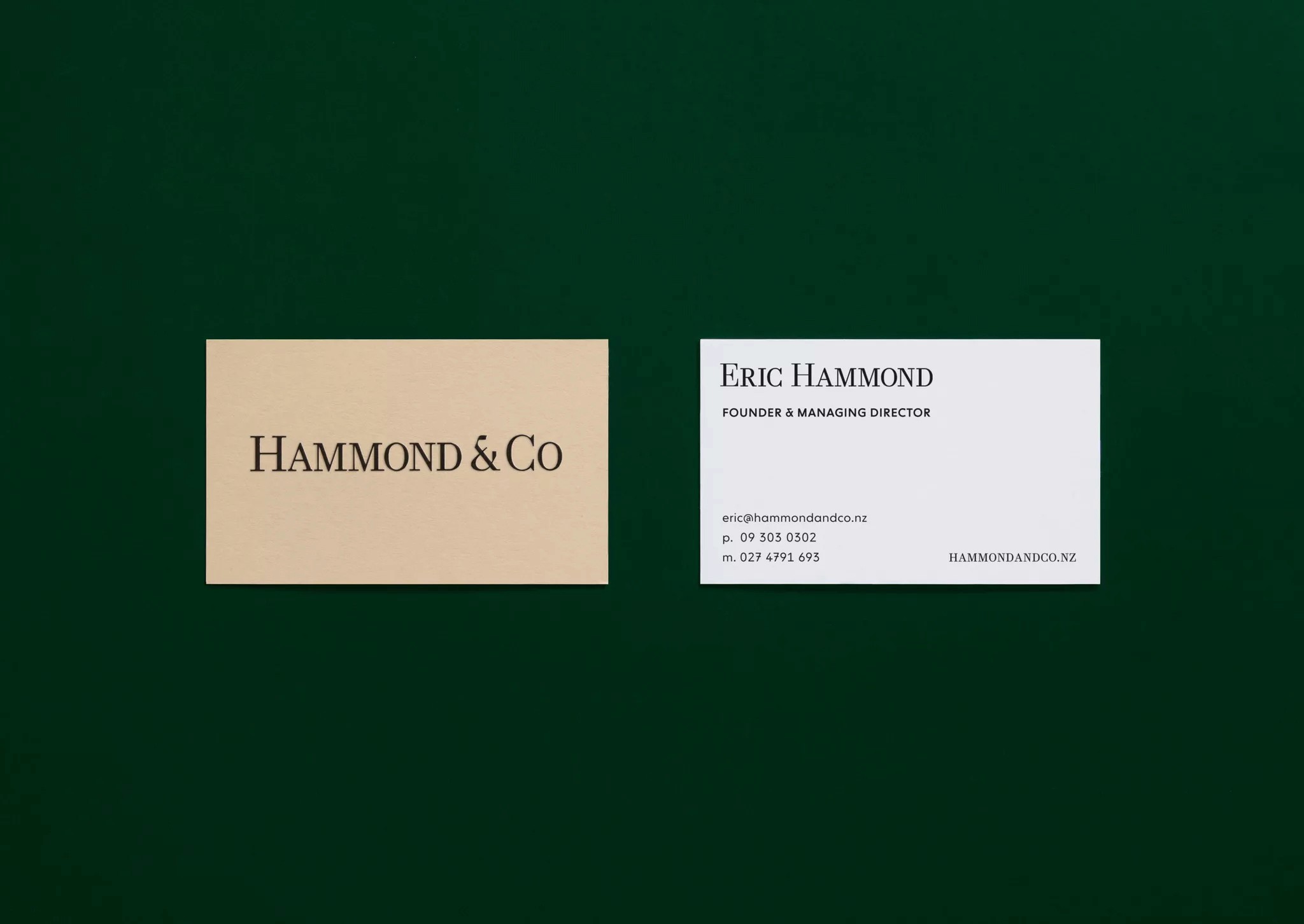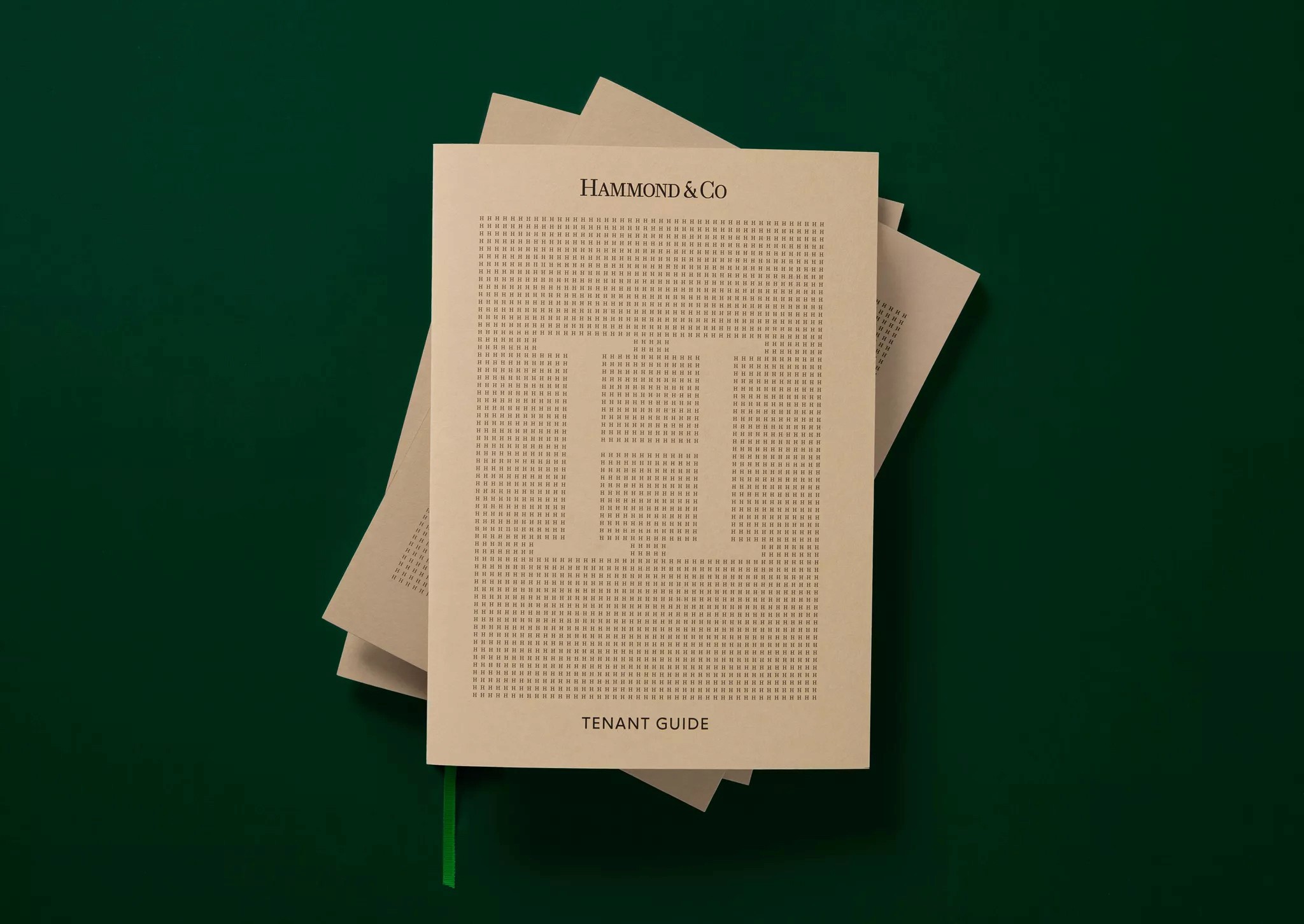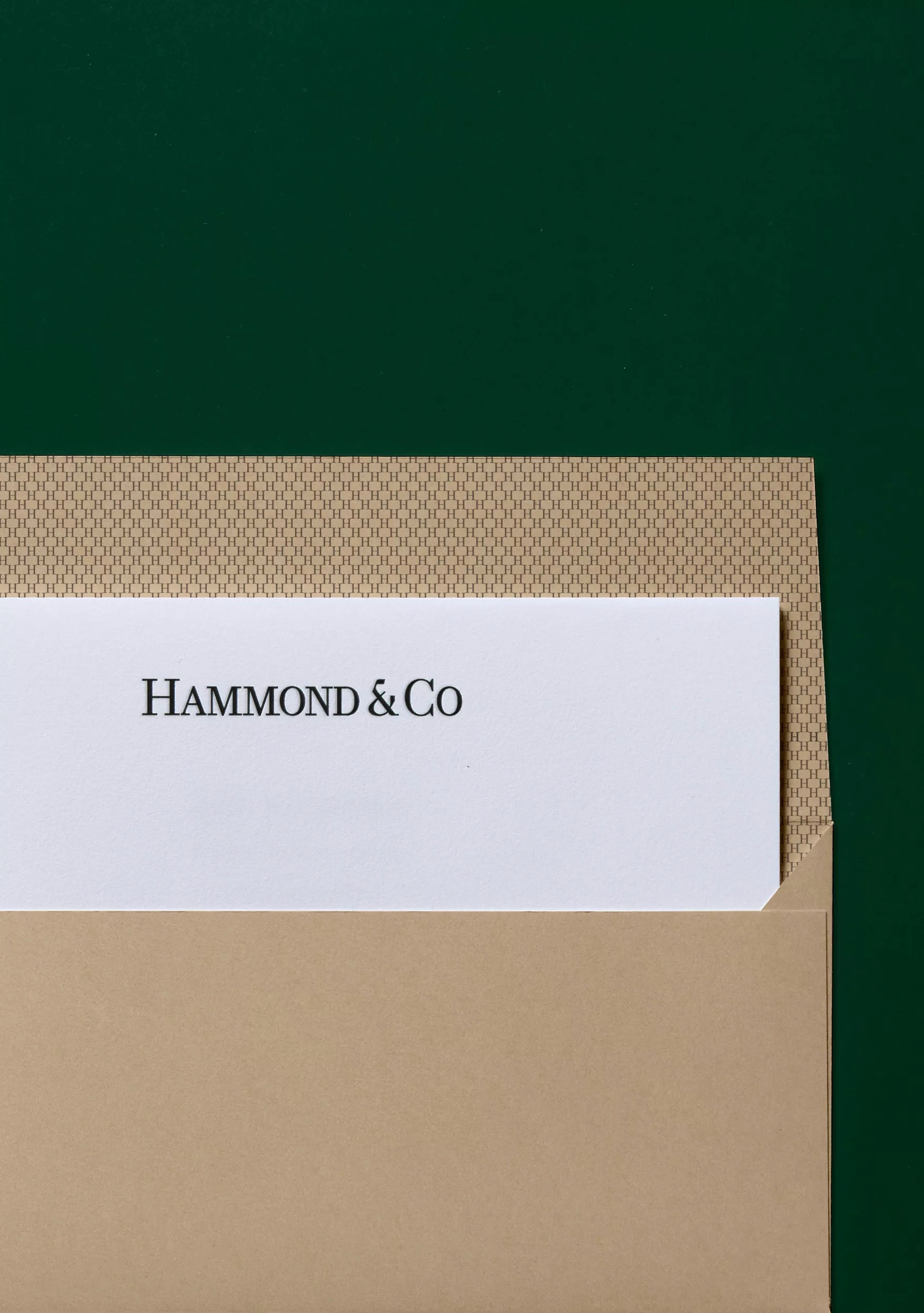 To reflect their level of expertise, experience and market niche they desired an identity that communicated their professionalism in a way that wasn’t expected within the category, avoiding retail real estate cheese. Traditional estate agent cues provide an established feeling within the Hammond & Co wordmark, this restraint and conservatism is juxtaposed by playful copy lines and a vibrant accent green. A wordmark the commands respect, customised letterforms are carefully crafted to create perfectly balanced smallcaps to counter the larger bookend caps. The stationery set uses premium uncoated stocks, contrasted with a tangible highbuild ink for the wordmark, reinforcing high quality brand cues.
