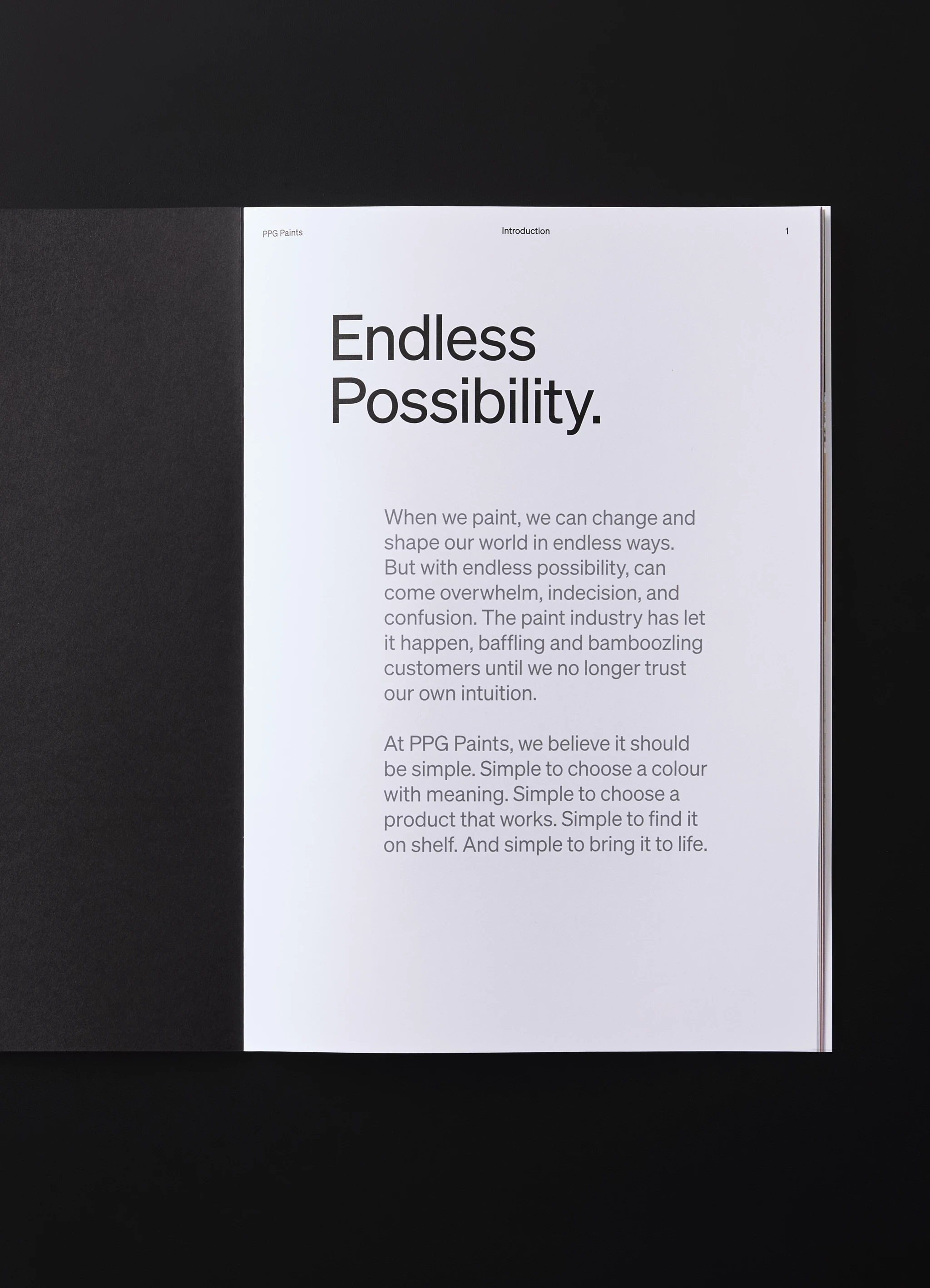 PPG Paints needed to be seen as an enabler and inspirer, who make choosing, and painting, easy. Just add colour. Starting in black and white, we invited readers into the story visually. We shared the possibility of a blank canvas, then shared the insight of audience pain points, before resolving PPG's strategic position in full colour. Telling the brand story and personality in the bright bold colours of PPG's campaigns, imbued an energy and positivity to inspire readers in how comms can help to create a positive, easy customer experience.