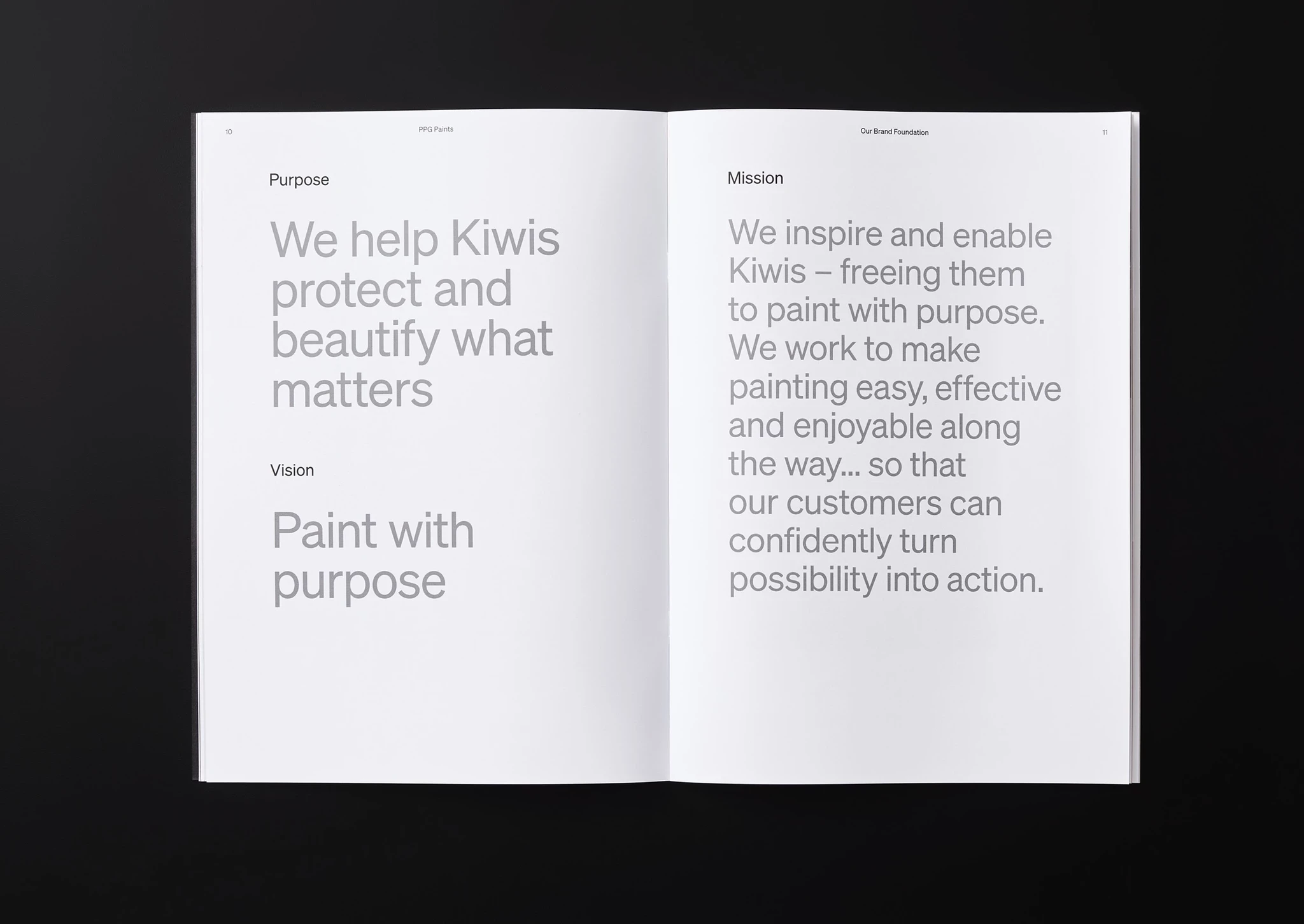 Paint is synonymous with colour. In a category that sells 80% white, the conversation is all about inspiration for everything but. The PPG Paints New Zealand brand book helps the marketing teams delivering the brand to understand it’s unique proposition. Their audience see painting as a chore, and are intimidated by the prospect of choosing colour.