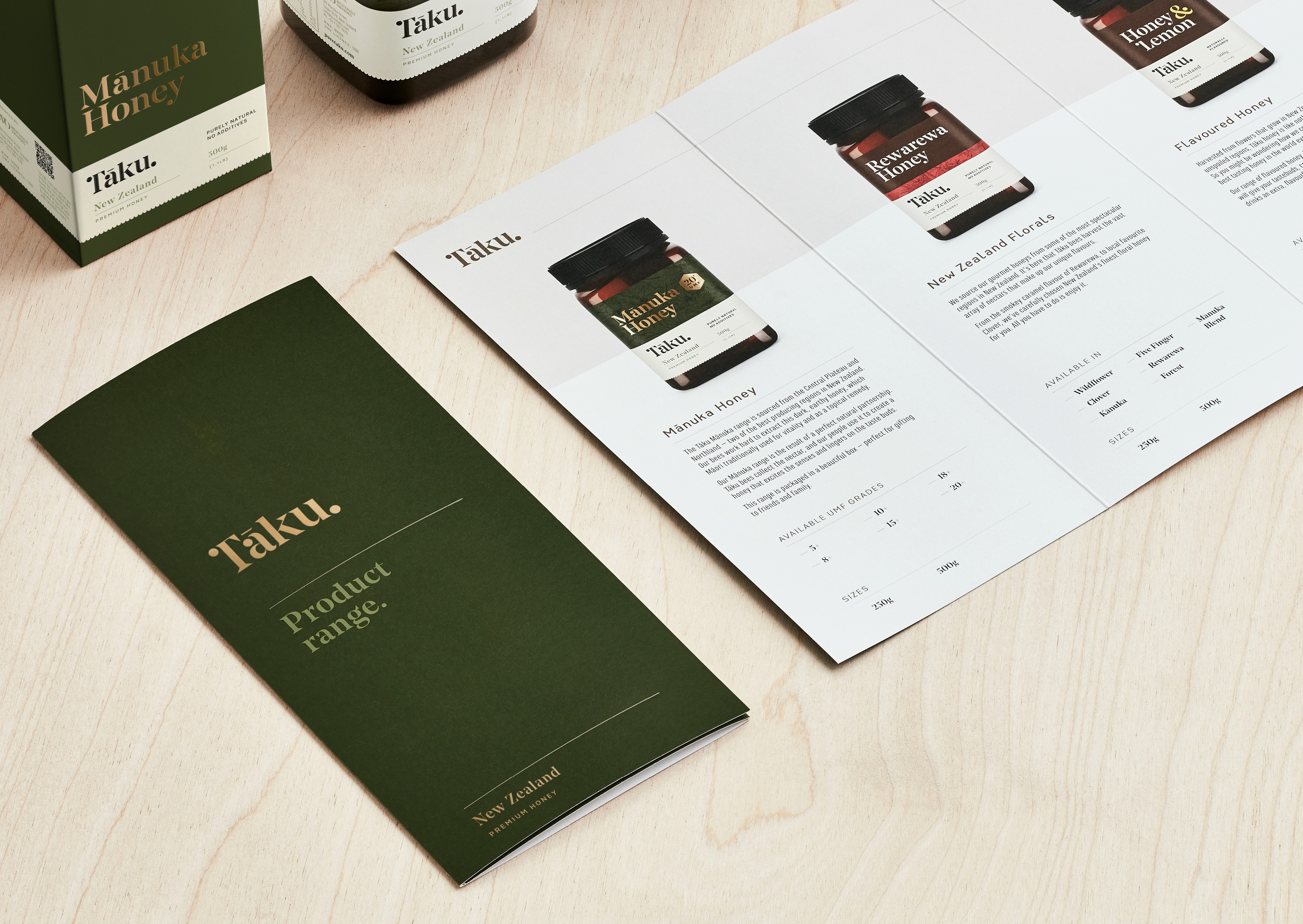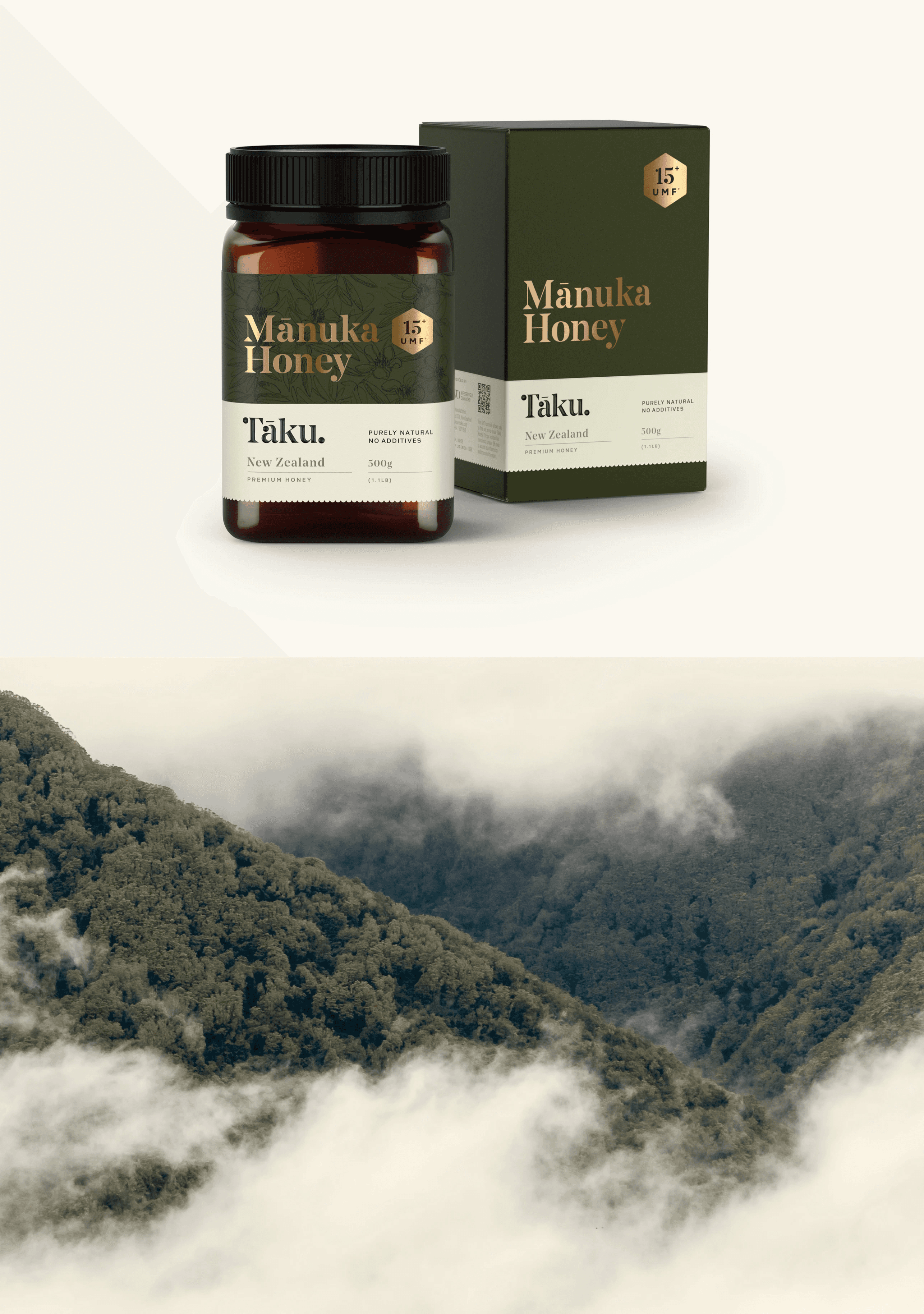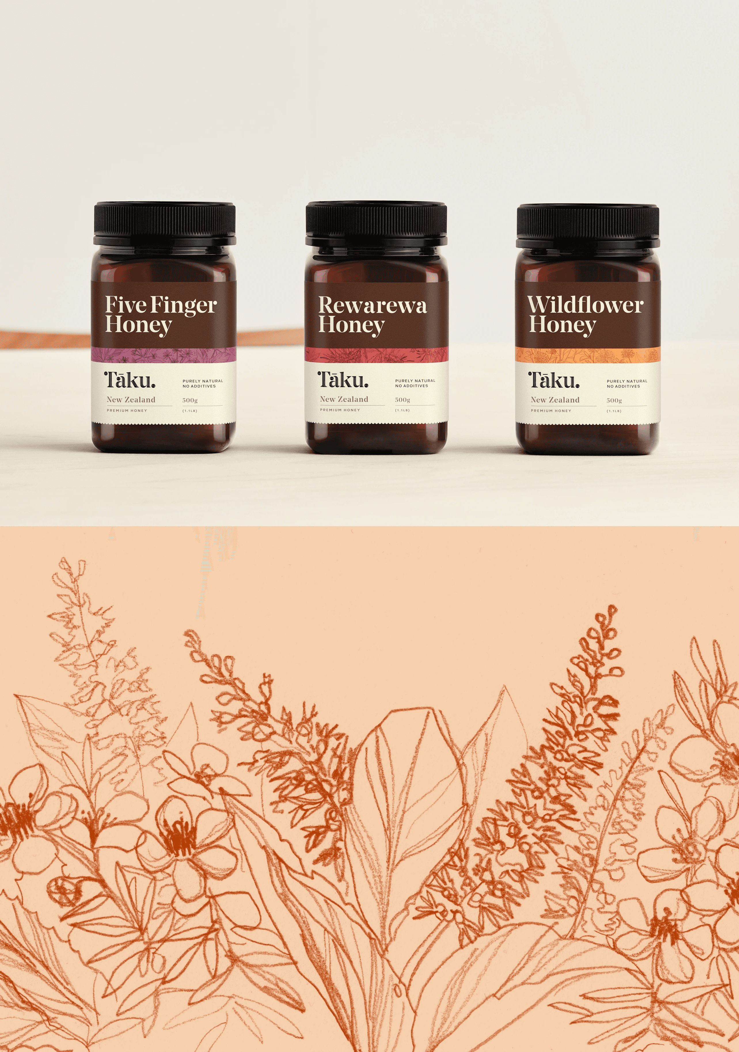 Westervelt Owhaoko, a joint venture between U.S.-based Westervelt and local Iwi, produces exceptionally pure Mānuka honey guided by the principles of Manaakitanga – caring for people and land. Tasked with rebranding Tāku Honey, the goal was to communicate artisanal craft, contemporary Māori culture, and rare provenance to global markets, particularly China and the U.S. Tāku means “my honey,” so the brand mark needed to feel personal, strong, and distinct. A custom wordmark incorporates a contemporary Māori koru, echoed across typography and a bespoke UMF mark. Packaging emphasises authenticity through regional storytelling, QR codes, batch stamps, and premium finishes like embossing and gold foil. Hand-drawn botanical illustrations and scalloped edges evoke natural, earthy qualities, appealing to both luxury wellness and eco-conscious consumers.