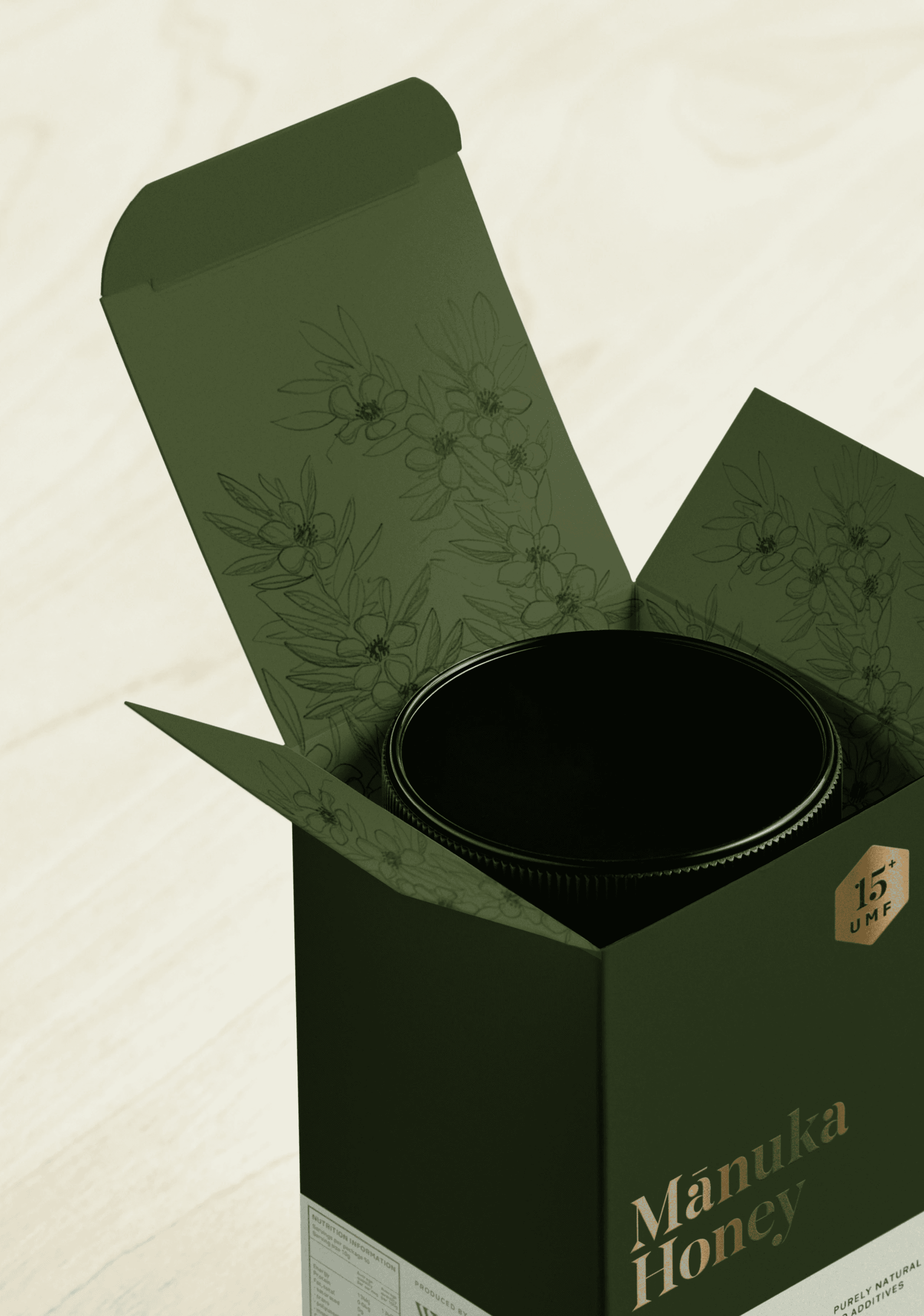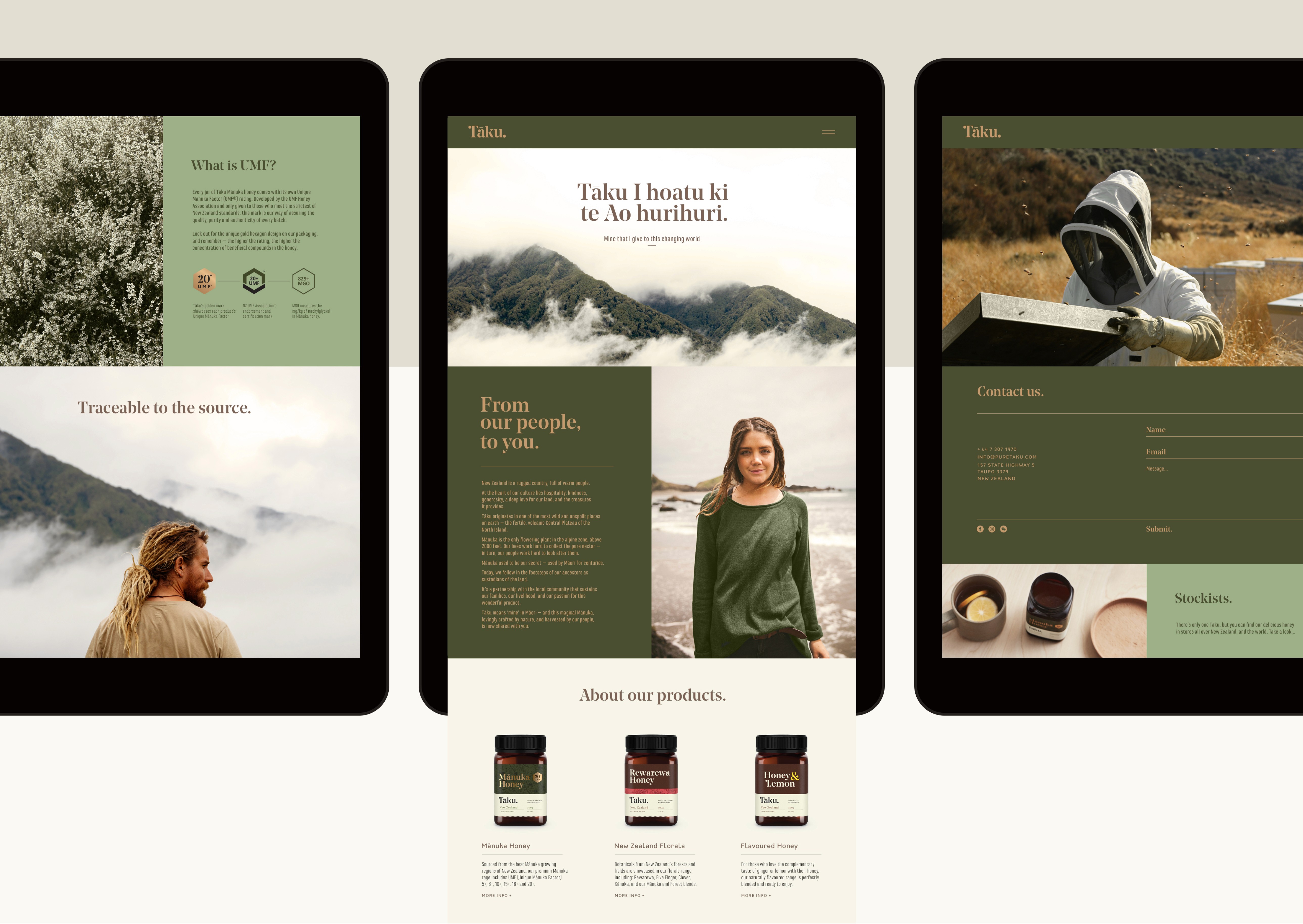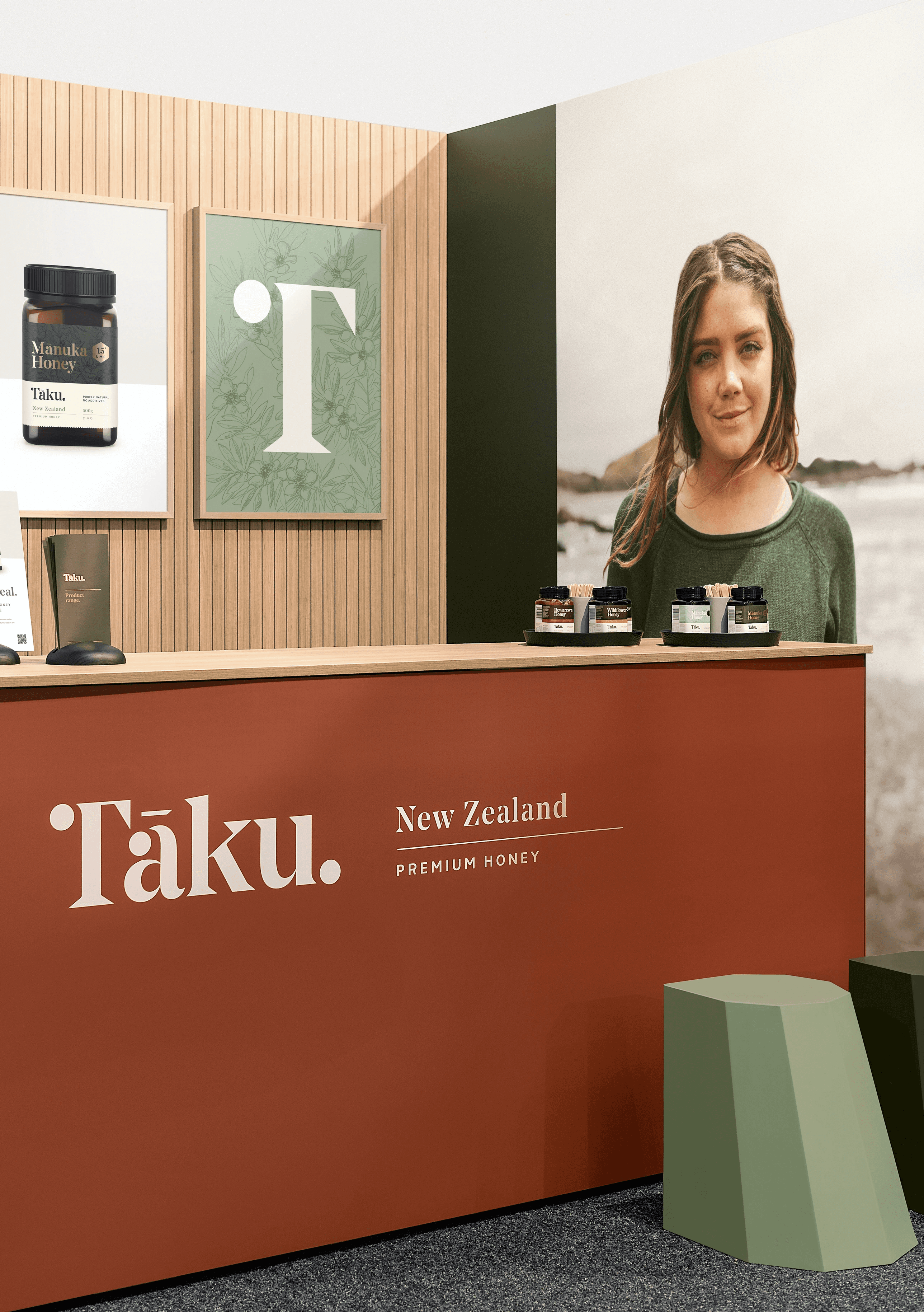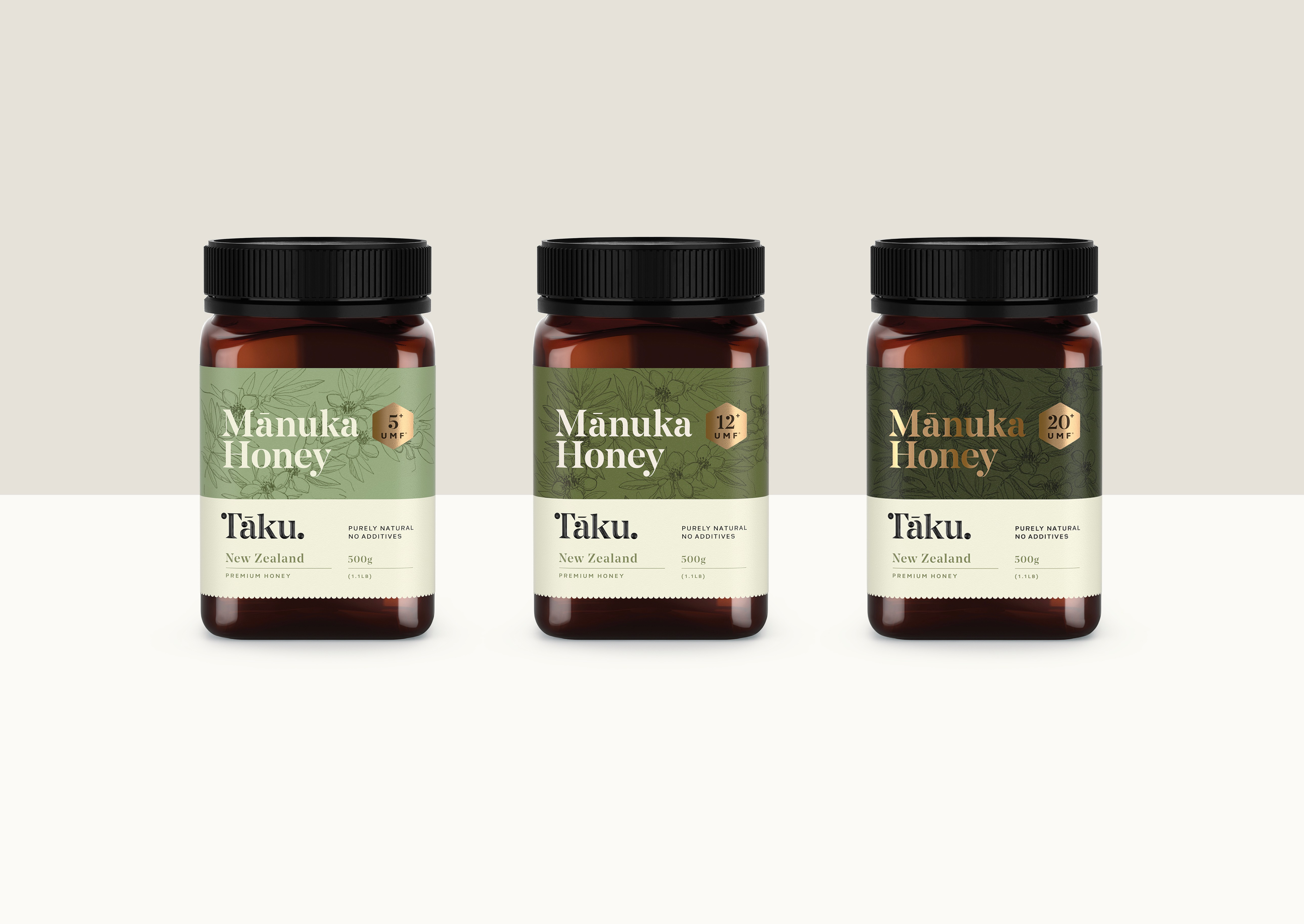 Westervelt Owhaoko, a joint venture between U.S.-based Westervelt and local Iwi, produces exceptionally pure Mānuka honey guided by the principles of Manaakitanga – caring for people and land. Tasked with rebranding Tāku Honey, the goal was to communicate artisanal craft, contemporary Māori culture, and rare provenance to global markets, particularly China and the U.S. Tāku means “my honey,” so the brand mark needed to feel personal, strong, and distinct. A custom wordmark incorporates a contemporary Māori koru, echoed across typography and a bespoke UMF mark. Packaging emphasises authenticity through regional storytelling, QR codes, batch stamps, and premium finishes like embossing and gold foil. Hand-drawn botanical illustrations and scalloped edges evoke natural, earthy qualities, appealing to both luxury wellness and eco-conscious consumers.